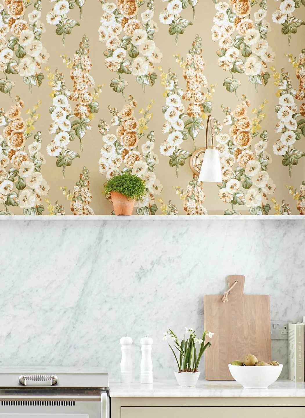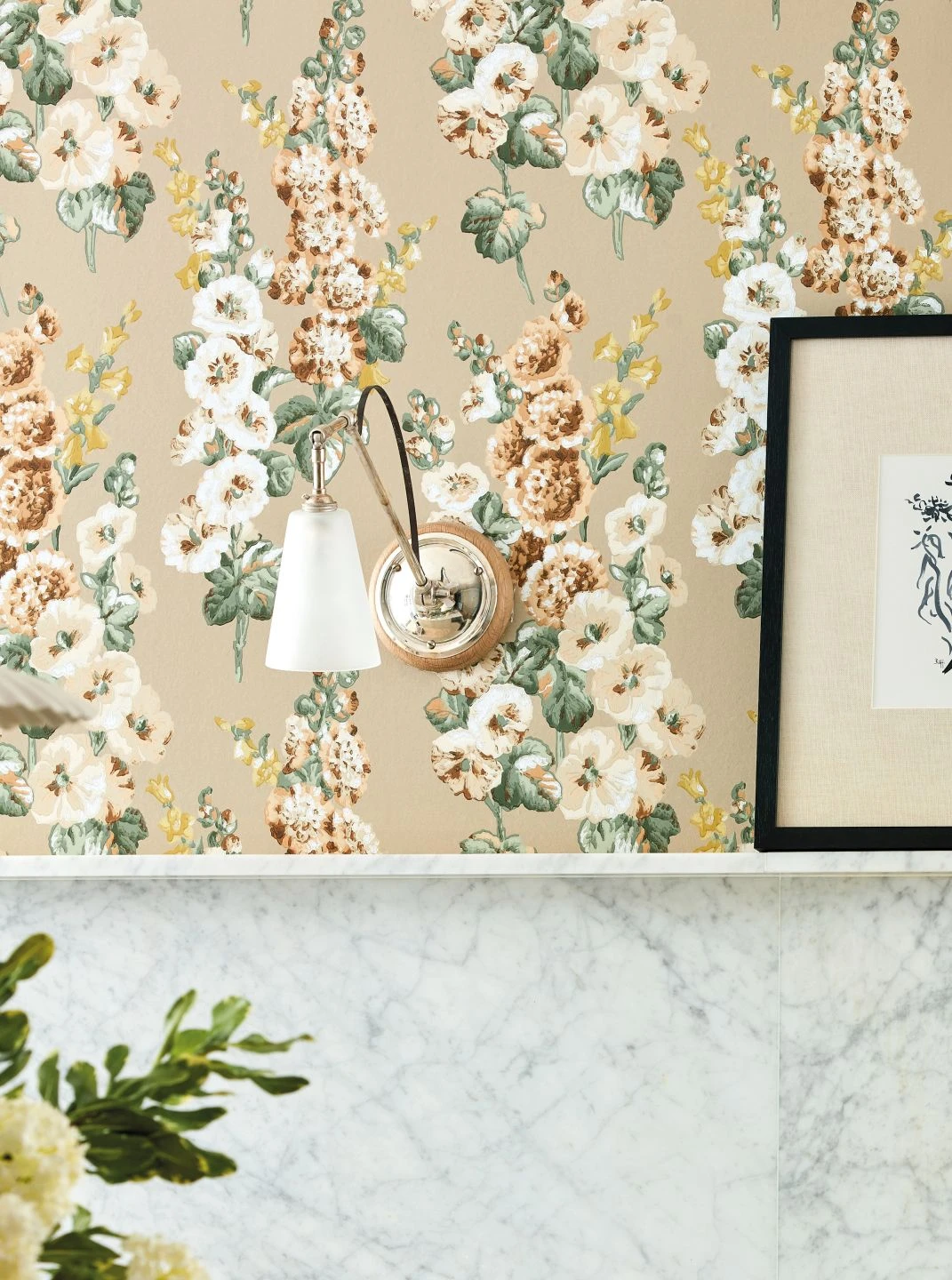 Ein liebevoll angeordnetes Arrangement aus Stockrosen schmückt die florale Tapete Wanda mit sommerlicher Ausstrahlung. Die dicht an den aufrechten Stielen stehenden Blüten sind in hellen, geschmackvoll ausgesuchten Nuancen von Beige, Elfenbein und Gelb gehalten, die sich mit den grünen Blättern und dem Beige des Grunds zu einem stimmigen Ensemble verbinden. Der Farbauftrag im Leimdruckverfahren betont die kunstvollen Farbflächen der Blüten und lässt sie plastisch wirken.