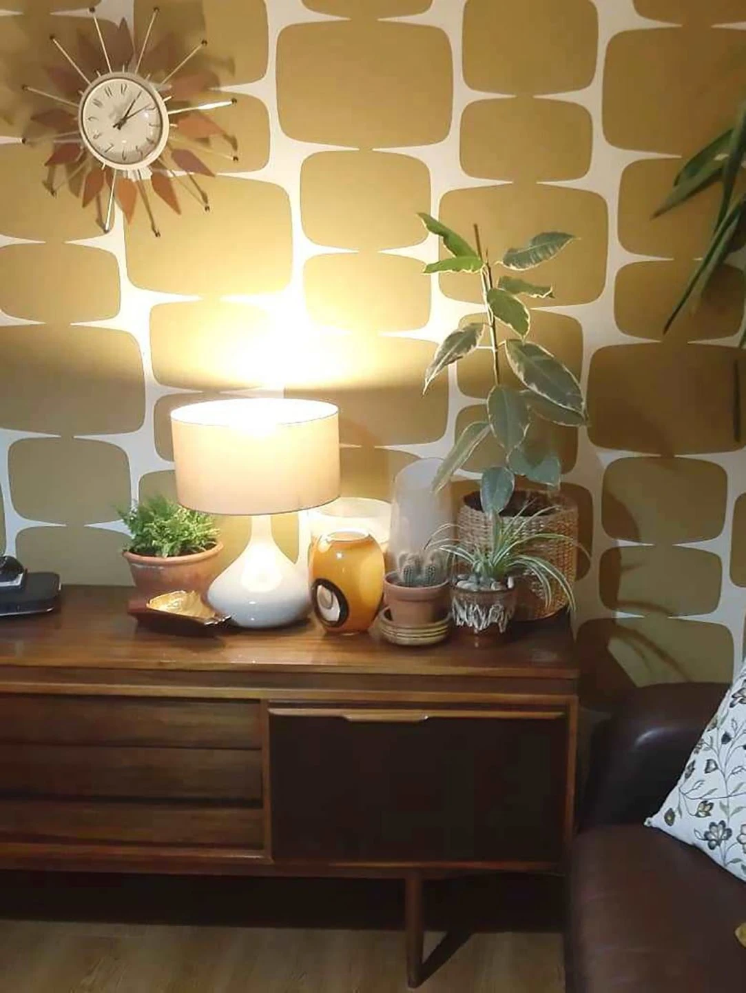 Ein großflächiges Muster aus ockerfarbenen Rechtecken mit abgerundeten Ecken bestimmt den Charakter der Vliestapete „Waris“. Mit ihrem Vintage-Design und dem ausdrucksstarken Ockerton, der in den 70er Jahren ebenso angesagt war wie jetzt, schlägt sie eine Brücke aus der bewegten Epoche ins Heute. Möbel mit charakterstarkem Retro-Charme sind eine perfekte Ergänzung. Farblich passen dunkle Holztöne besonders gut.