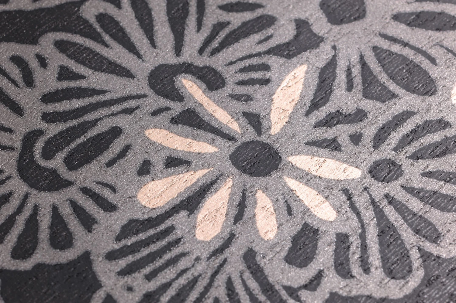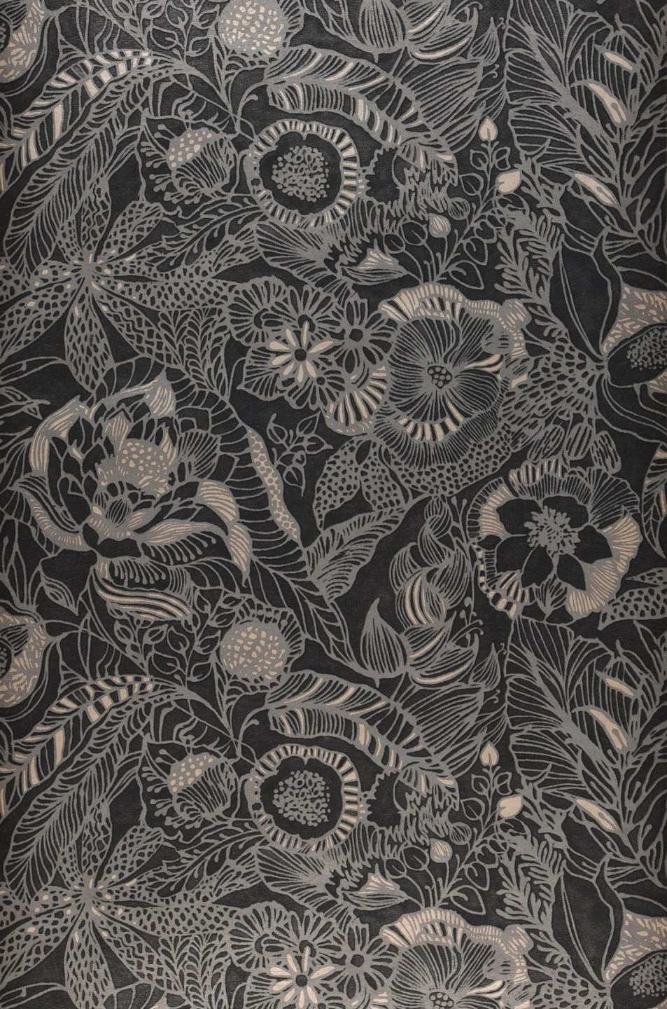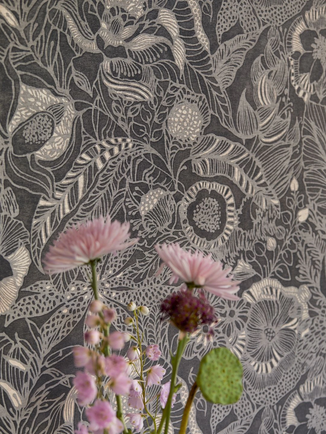 Auf dem schwarzgrauen Grund der Vliestapete sind mit schimmernden graualuminiumfarbenen Linien die Umrisse einer wahren Fülle verschiedenster Blüten und Blätter angedeutet. Cremefarbene Bereiche setzen attraktive Highlights. Der Kontrast zwischen den dunklen Farben und dem leichten Schimmer des Graualuminium kreiert einen unvergleichlich lebendigen und gleichzeitig ruhig ausgeglichenen Raumeindruck.