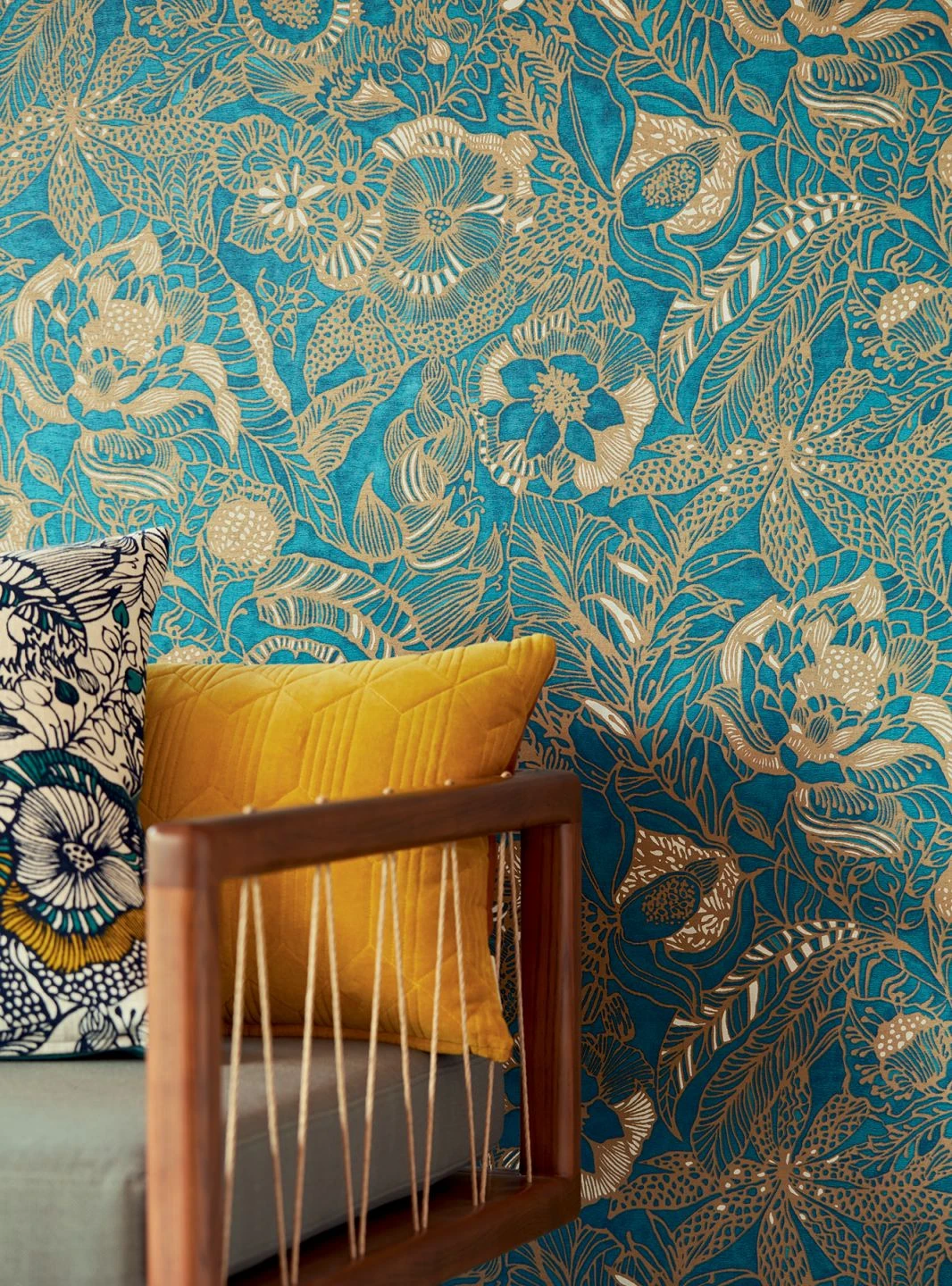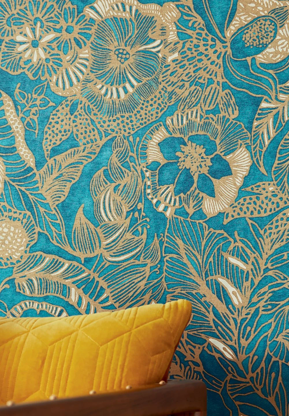 Ein dichter Dschungel von üppigen Blüten und Blättern entsteht allein durch mattgoldene, teilweise mit Cremeweiß gefüllte Umrisse auf dem leicht schimmernden, fein strukturierten Untergrund in leuchtendem Wasserblau. Die Lebenskraft und die überbordende Fülle und Formenvielfalt der Blumen beleben Ihre Wand mit der eleganten Kombination aus Gold und Blau. Helle Holzfarben oder weiße Möbel ergeben ein freundliches, stimmiges Ensemble.