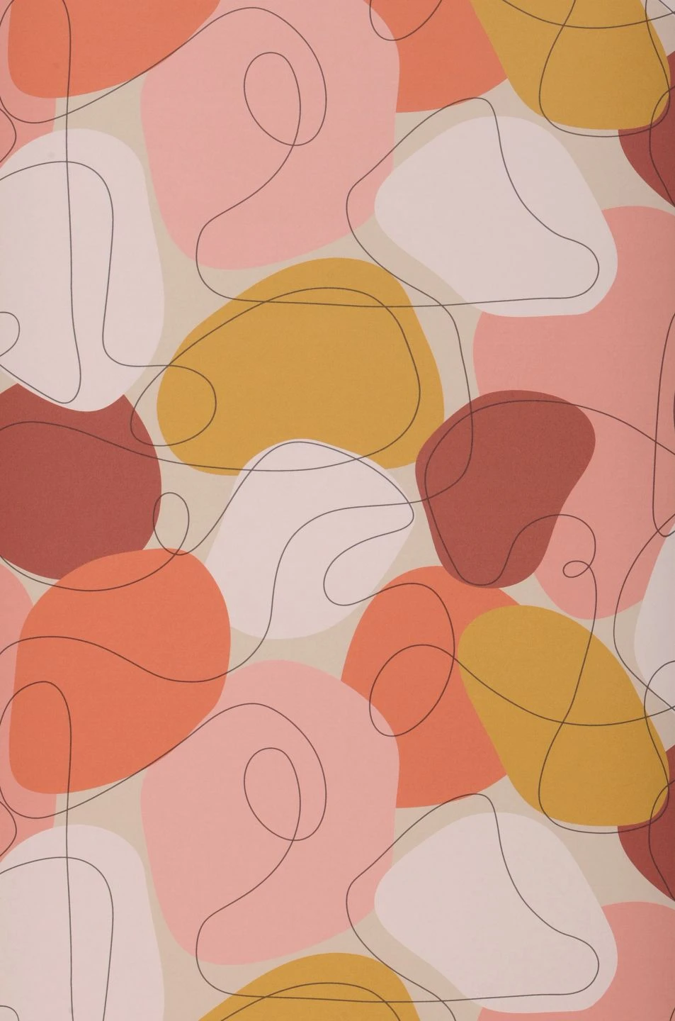 Belebend und Energie spendend sind die Rottöne und das Senfgelb, die den lebhaften Charakter der ausdrucksstarken Tapete bestimmen. Unregelmäßig geformte Farbflächen und wie zufällig hingekritzelte geschwungene Linien erinnern an die abstrakte Darstellung sommerlich blühender Blumen. Das Design, das die unbekümmerte Pop Art der 60-er Jahre zum Leben erweckt, passt prima zu Vintage-Möbeln mit den geschwungenen Konturen der Flower-Power-Ära.