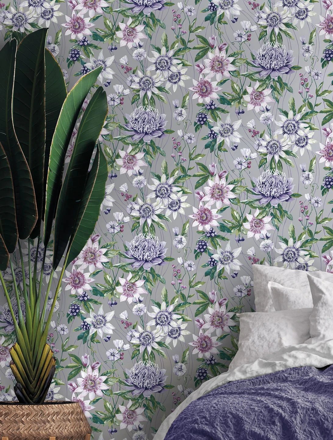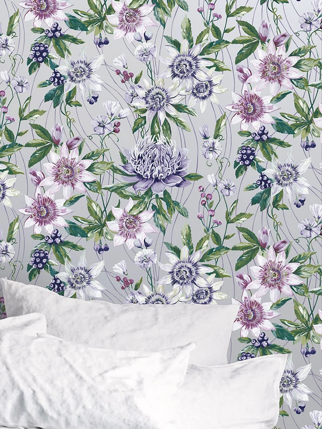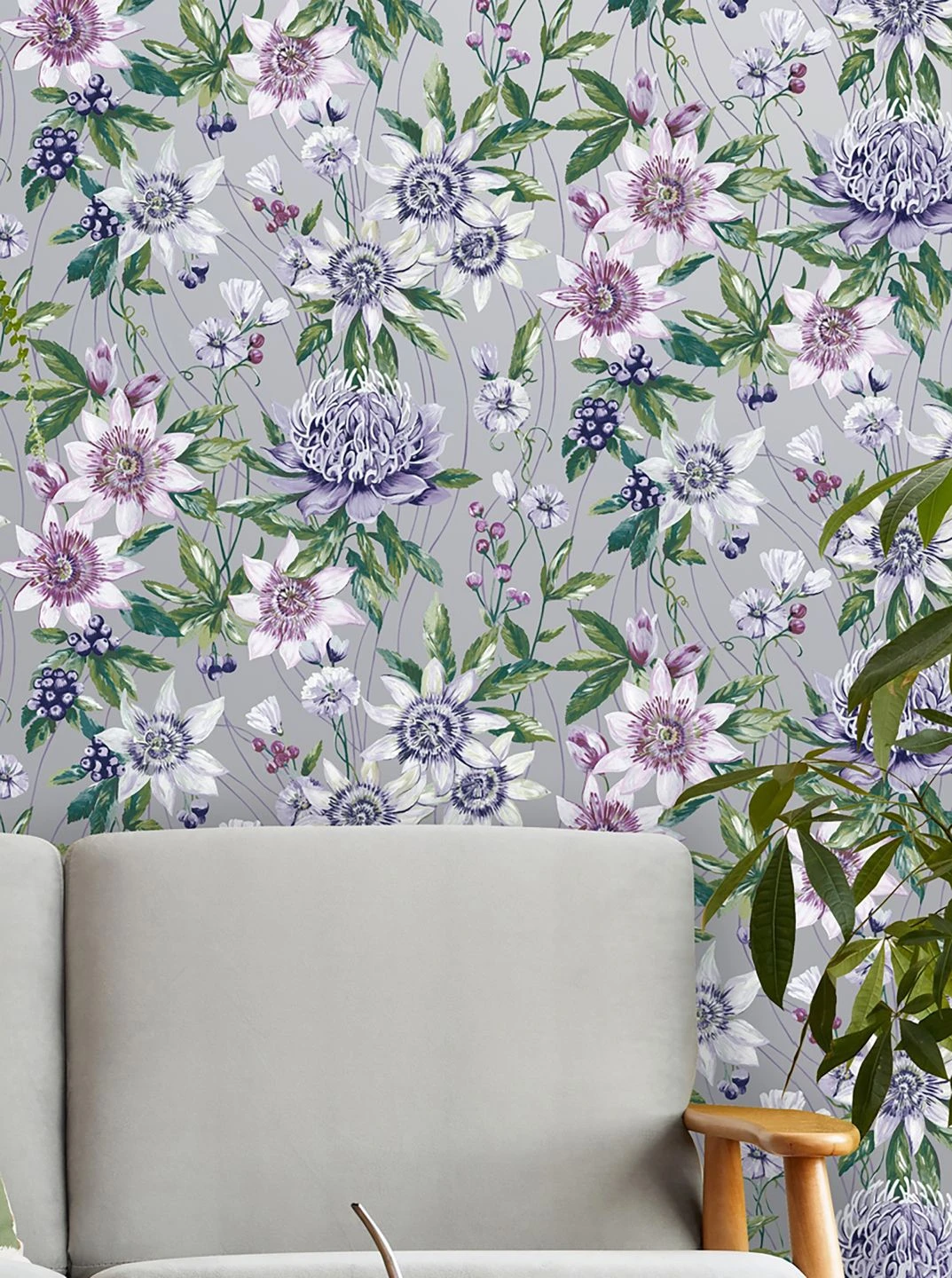 Vliestapete Zagora ist keine alltägliche Blumentapete. Auf dem leicht schimmernden silbernen Grund sind verblüffend detailgetreu ganz unterschiedliche mediterrane Blumen und Früchte abgebildet. Besonders fallen die Blüten der Passionsblume ins Auge. Die matten, zarten Nuancen von Violett und Weiß sowie die Grüntöne der Blätter verbinden sich mit dem Silber des Untergrunds zu einem zauberhaften Gesamtbild.