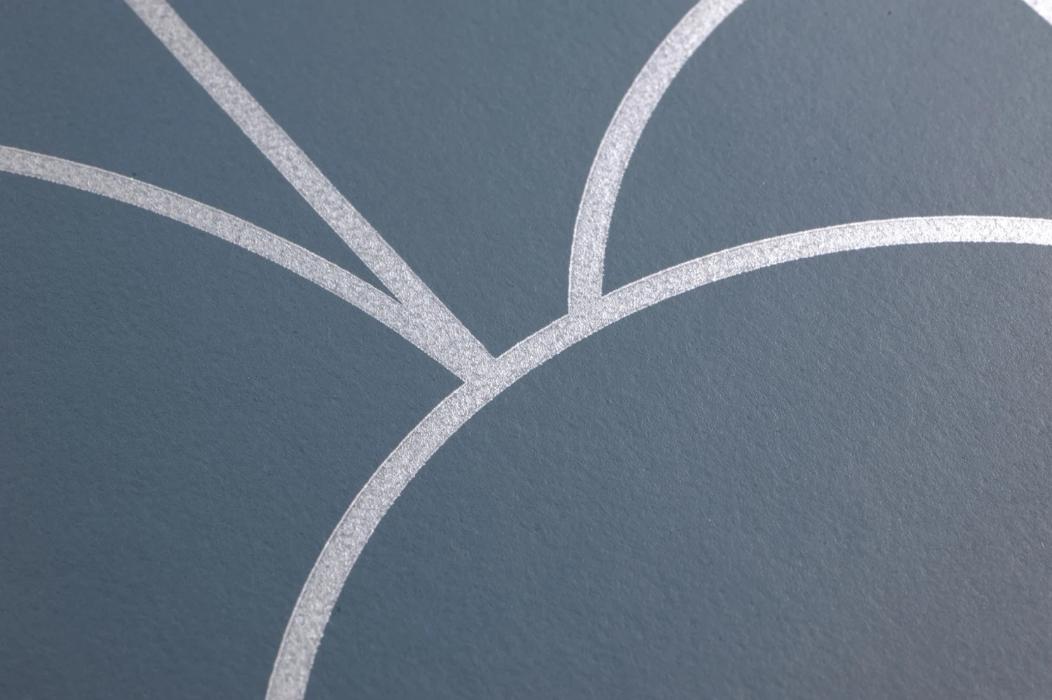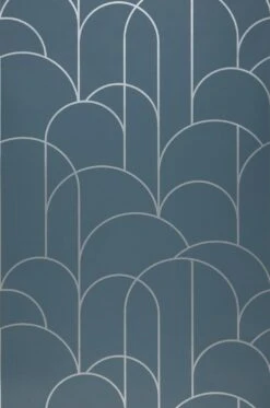 Ein ruhiges, mattes Blaugrau bildet den Hintergrund für fein umrandete, symmetrische Bögen im leicht schimmernden Farbton von Weißaluminium. Die filigranen Umrisse der Bögen beleben den dunklen Grund der Tapete auf elegante Weise ganz im Stil des Art Deco. Helle, weiße oder metallfarbene Möbel im Vintage-Look sind eine schöne Entsprechung für die hochwertige Vliestapete.