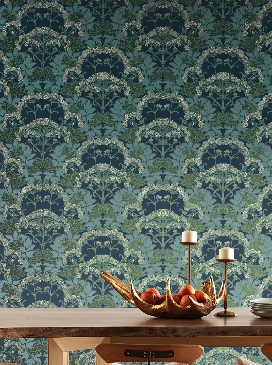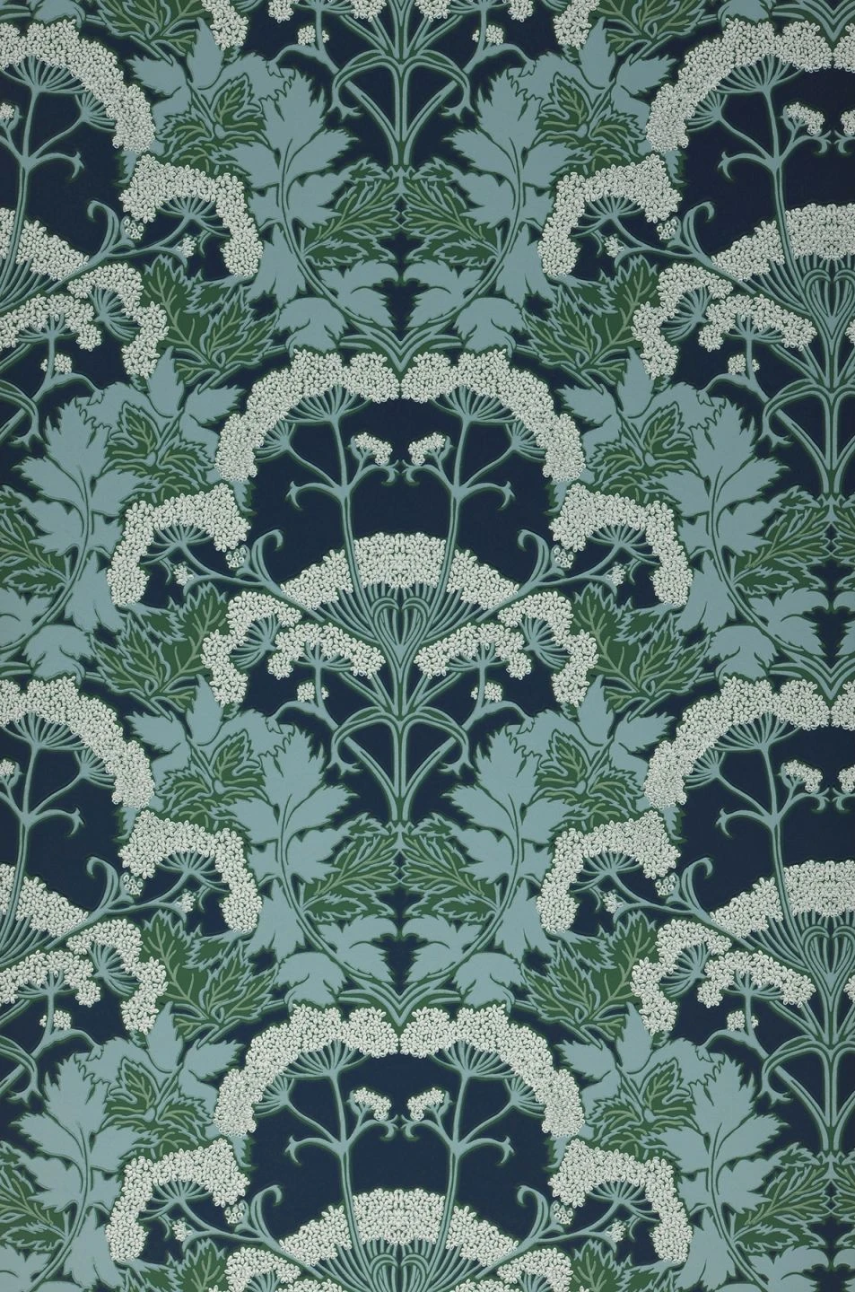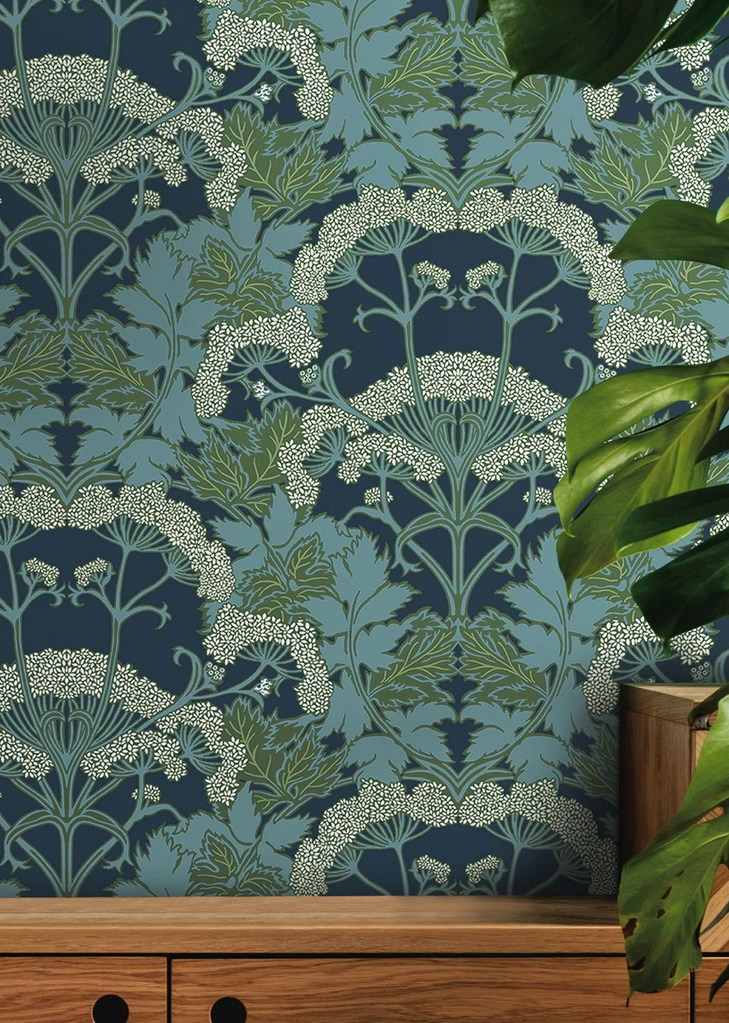 Jugendstil in Perfektion – die weißen Blüten erinnern an im Mondlicht leuchtende Wiesen voller Schafgarbe, doch die typische Stilisierung lässt keine Illusion von Realismus zu. Die im Leimdruckverfahren hergestellte Vliestapete kombiniert die Farbtöne Dunkelgrün, Minttürkis und Grauweiß auf dunkelblauem Grund und empfindet die Farbschattierungen einer Sommernacht nach.