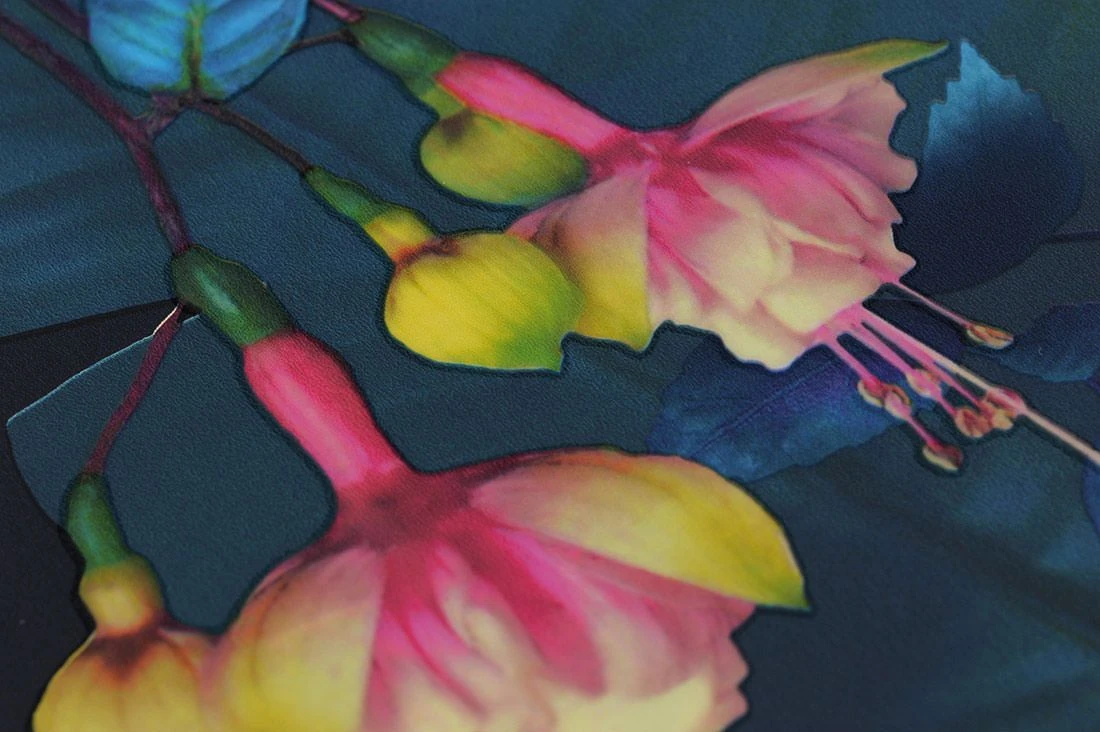 Ein Blütenrausch in Blautönen, Gelbgrün, Hellviolett, Türkis und Weiss mit eindrucksvollem Bildeffekt, der durch den schwarzblauen Hintergrund an magischer Sinnlichkeit gewinnt. Die florale Mustertapete mit fühlbarem Relief wird durch den exotischen Kontrast aus zarten Blüten und tropischem Blattwerk belebt.