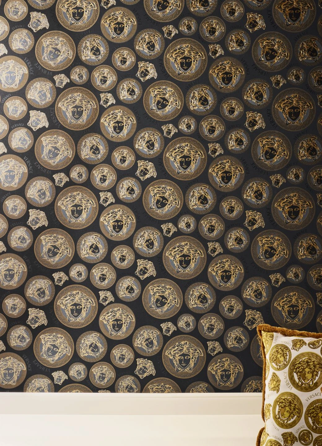 Ein außergewöhnlicher Wandschmuck für eine exklusive, stilvolle Einrichtung ist Vliestapete Athene aus dem Hause Versace. Die kreisrunden Ornamente in schimmerndem Schwarz, Mattgold und Perlgold zeigen das Haupt der Medusa und erinnern an die Darstellungen der griechischen Antike. Sie sind als Relief auf dem Vinyl der Tapetenoberfläche fühlbar und geben Ihrem Raum ein klassisches, aber durch die verschiedenen Größen und Ausrichtungen der Kreise zugleich lockeres Flair.