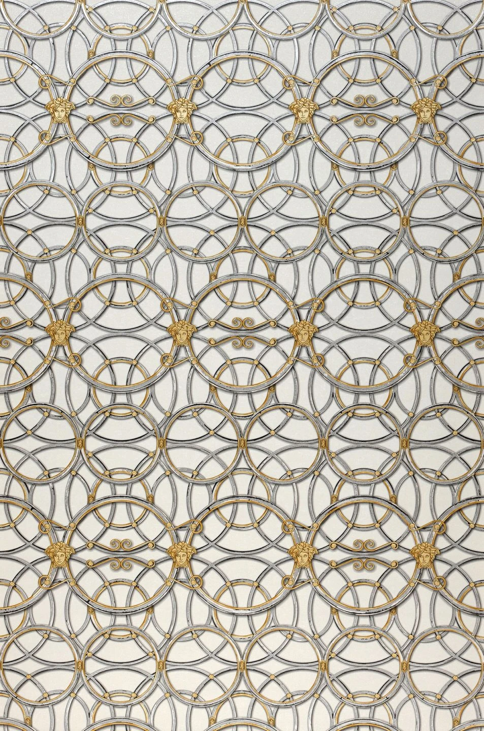 Mit Ringketten, die sich vor, hinter sowie ineinander verflechten und von Medusen-Köpfen flankiert werden, präsentiert sich die helle und goldaffektierte Variante des Versace-Tapetenmodells Nara. Das dominante reliefartige Muster fordert den Betrachter und ist für Räume, in denen Kreativität gefragt ist, ideal. Durch die scheuerbeständige Vinyloberfläche wird die Tapete selbst hohen Reinigungsanforderungen gerecht.