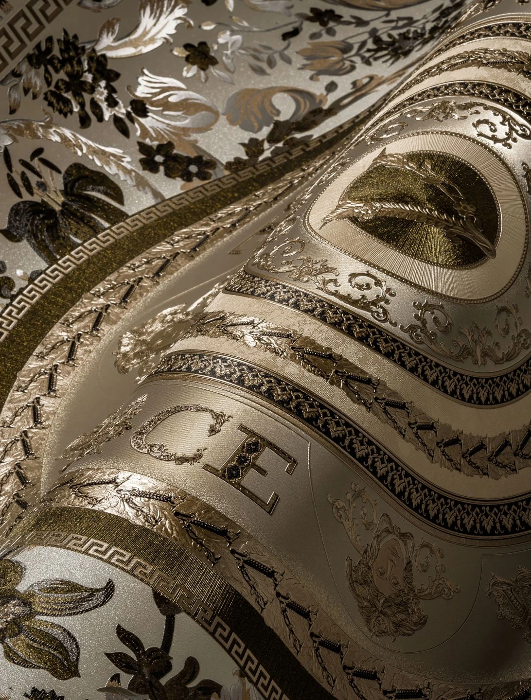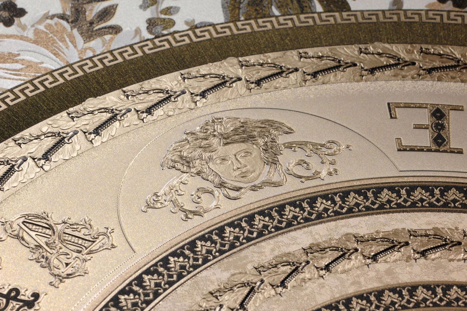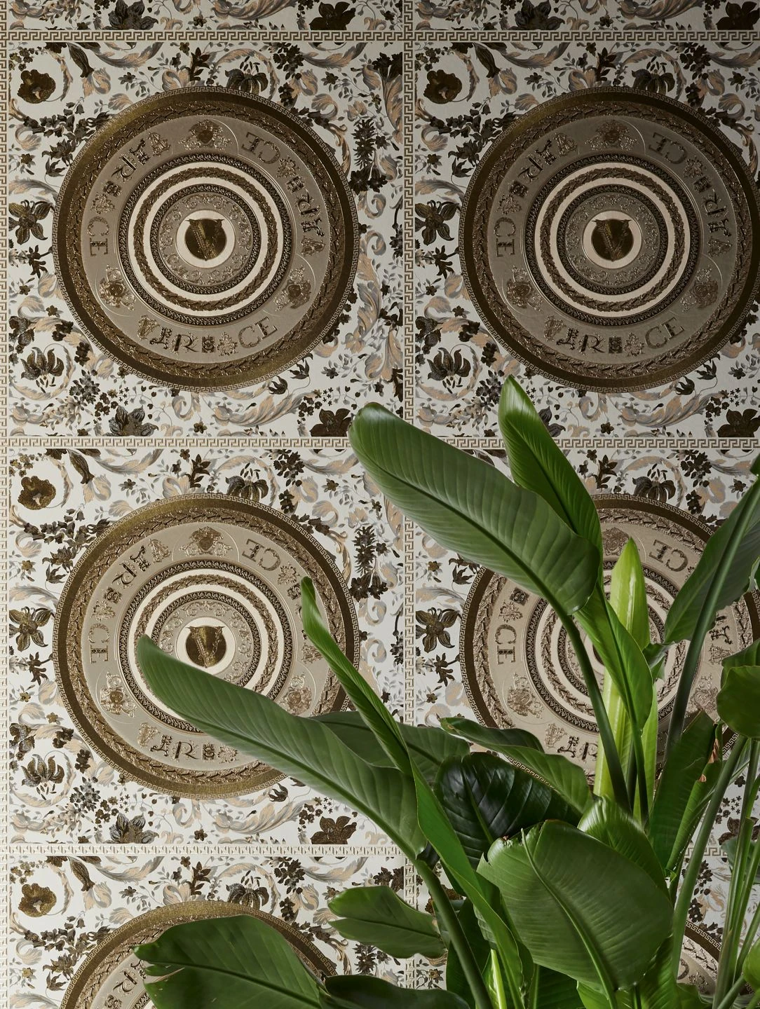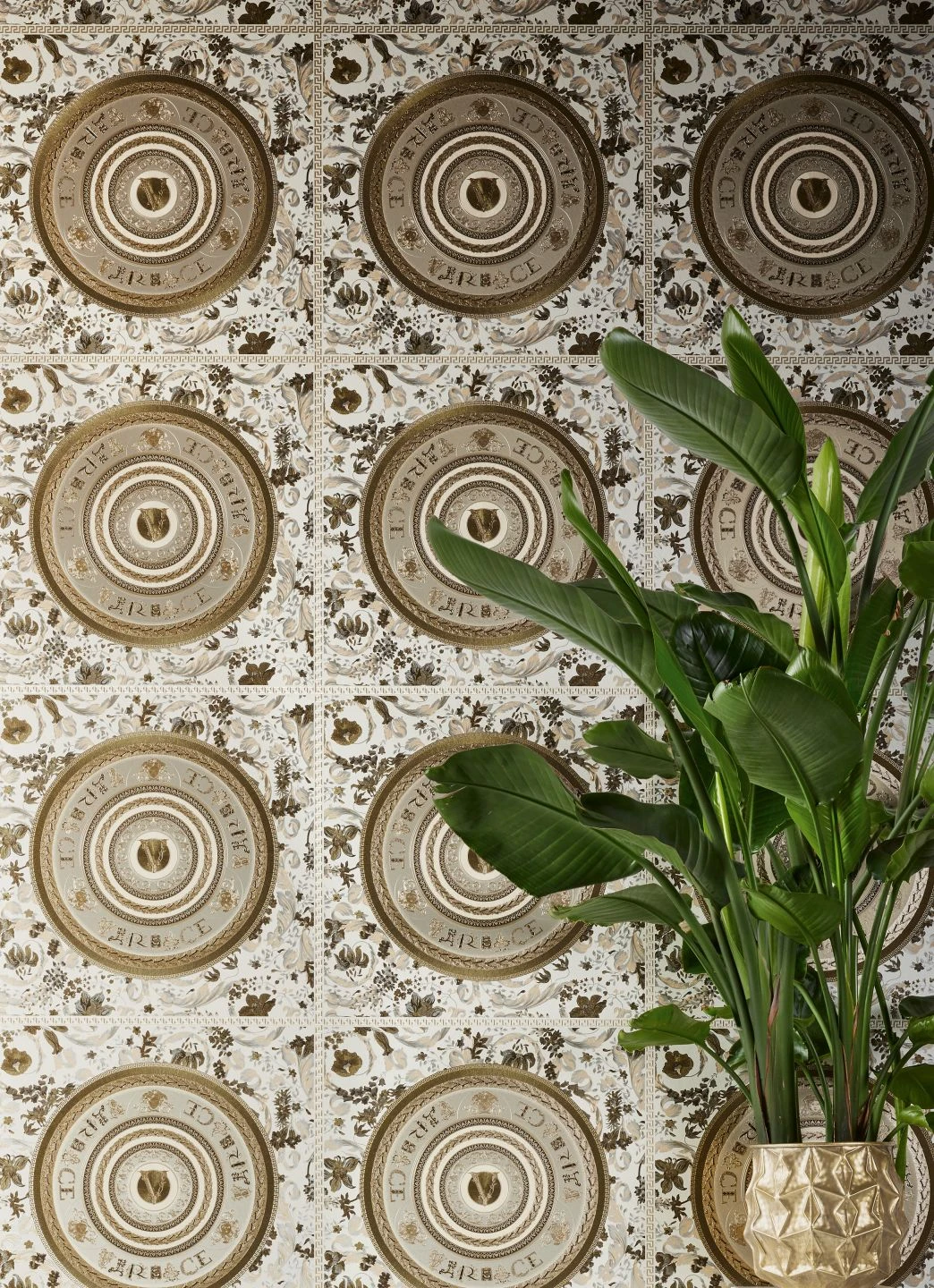 Die Zusammenstellung verschiedener Braun- und Grautöne übt in Verbindung mit dem raffinierten Muster von Vliestapete Venus einen besonderen Zauber aus. Leicht schimmernd und in das Vinyl der Oberfläche als fühlbares Relief eingearbeitet, ziehen kreisförmige Ornamente den Blick auf sich. Sie sind umgeben von stilisierten Blüten und Blattranken, während Bänder mit dem typisch antiken Mäander-Muster die Fläche Ihrer Wand in große Kacheln zu unterteilen scheinen.