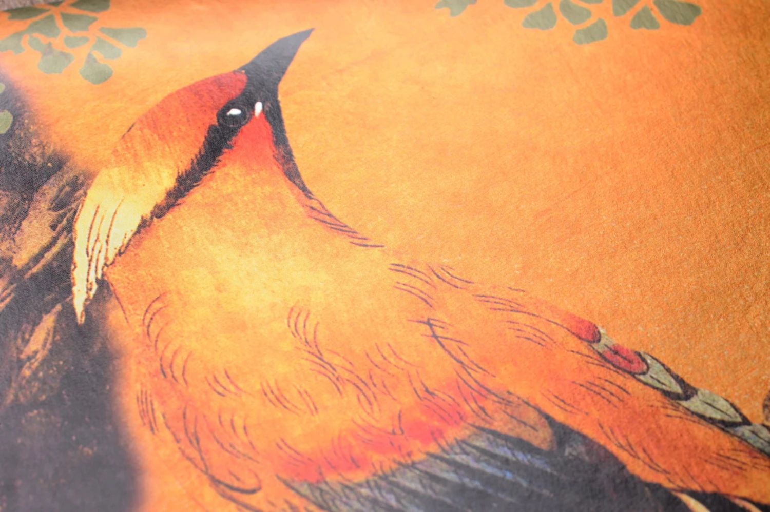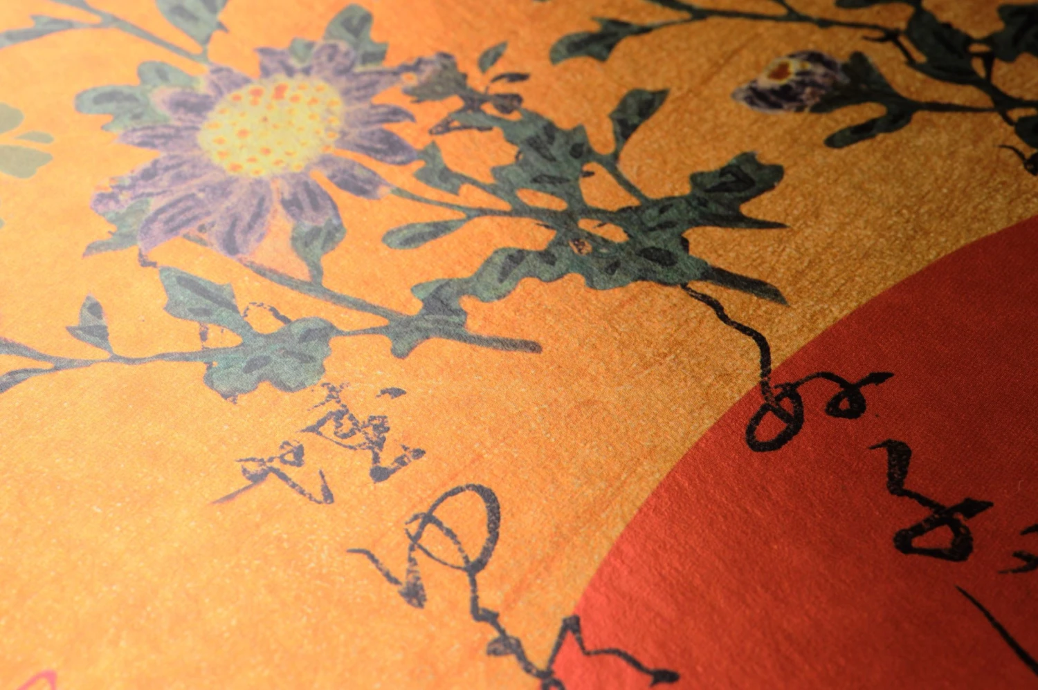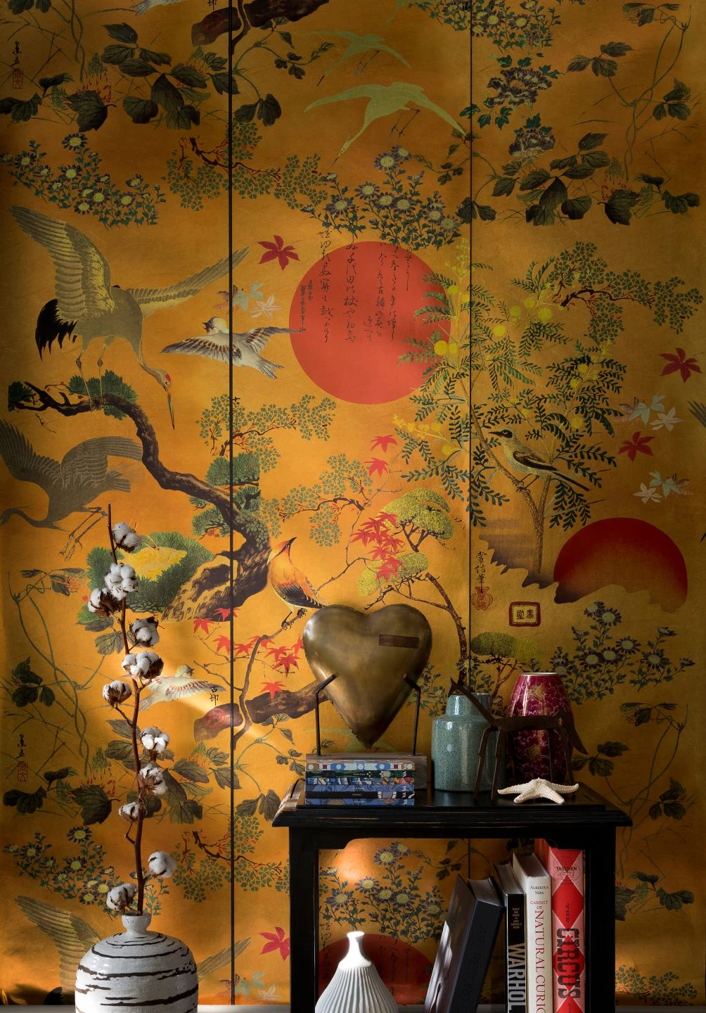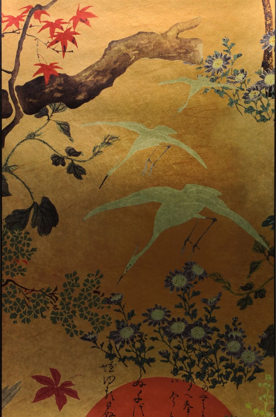 Kostbar wie die Dekoration im Palast eines japanischen Kaisers wirkt das dreiteilige Wandbild Byobu durch den Glanz des Metallic-Effekts, den der gelbgoldfarbene Hintergrund verströmt. Auf dem luxuriösen Untergrund finden sich Elemente der asiatischen Kunst: Kraniche, die als Glücksbringer gelten, Blumen, Ahornblätter und japanische Schriftzeichen. Der Eindruck eines wertvollen Paravents wird durch die schwarzen Umrahmungen, die die drei Bildteile voneinander absetzen, noch verstärkt.